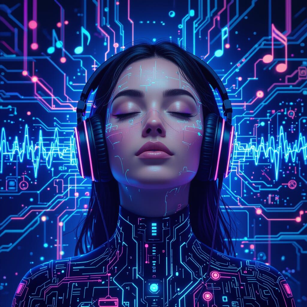 This image shows a person with headphones, eyes closed, amidst glowing circuits, soundwaves, and neural network patterns. The futuristic scene blends organic and technological elements in bright, neon colors as digital art.
