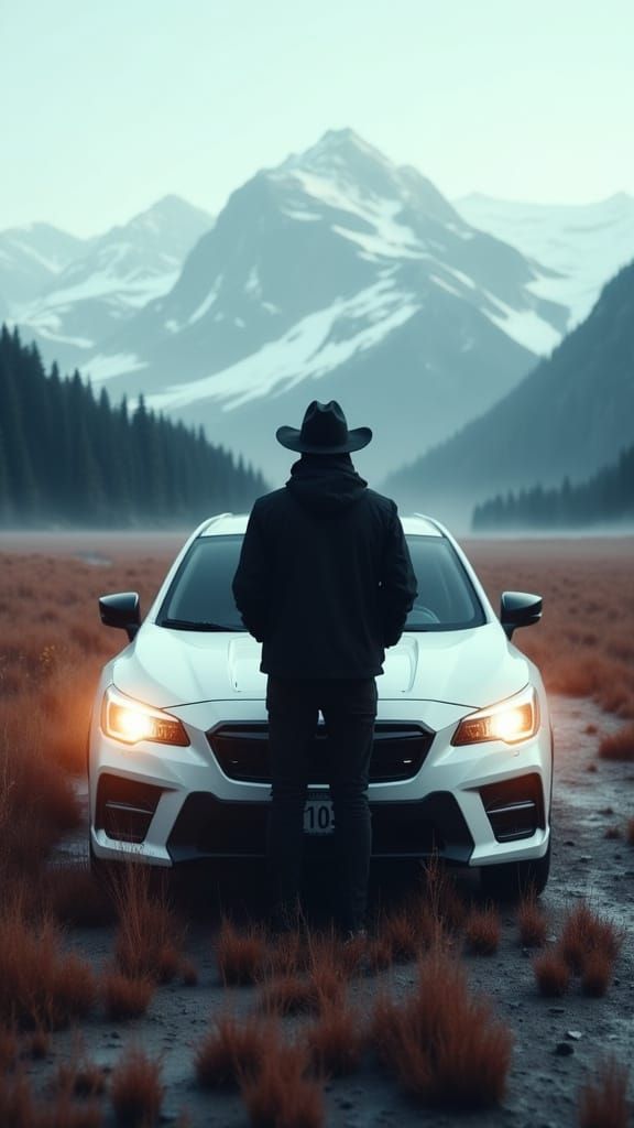 A cinematic shot of a young man in dark clothing near a white car, set against a serene backdrop of foggy mountains and wild nature. The image features vibrant colors and film grain.