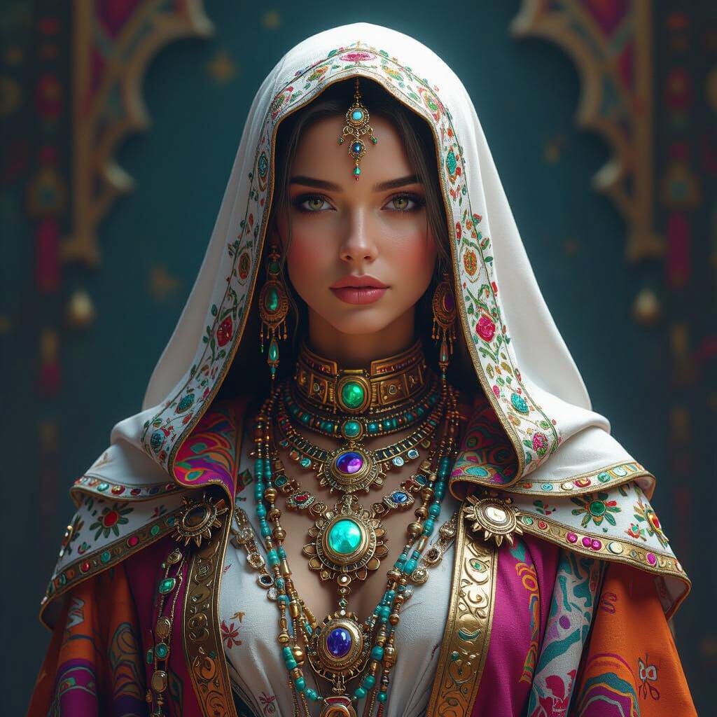 This image shows a pale woman with futuristic jewelry and vibrant robes. The digital painting evokes fantasy concept art with metallic accents and rich detail.