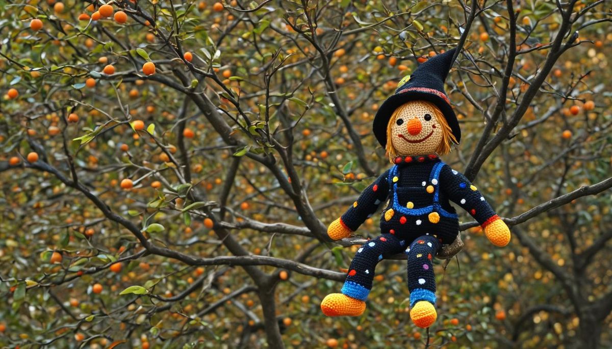 This image shows a charming amigurumi scarecrow doll perched on a tree branch. The folk art style illustration features warm colors and soft, rounded stitching, creating a happy, autumnal scene.