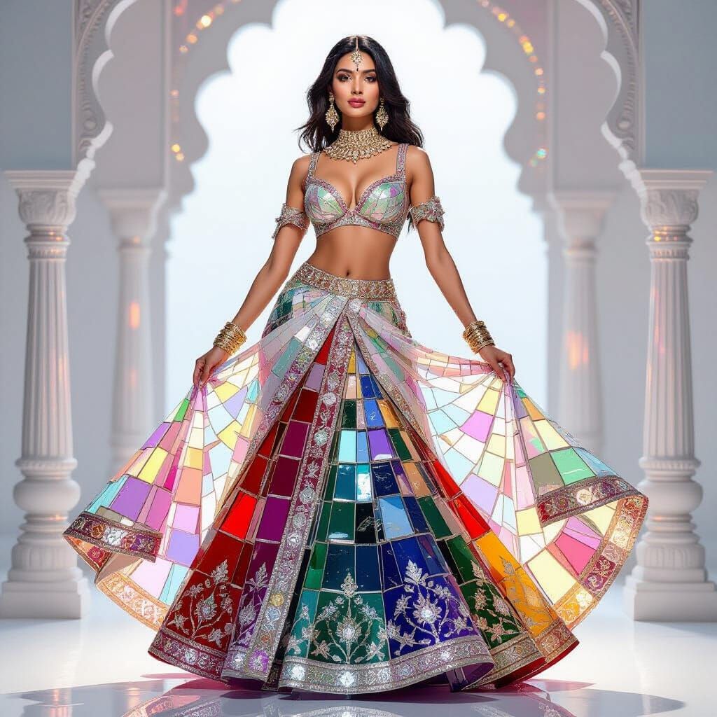 This image shows a striking sculpture of an Indian woman formed from mosaic glass. She is adorned in traditional attire made of luminous tiles in jewel tones, posed gracefully as if dancing.