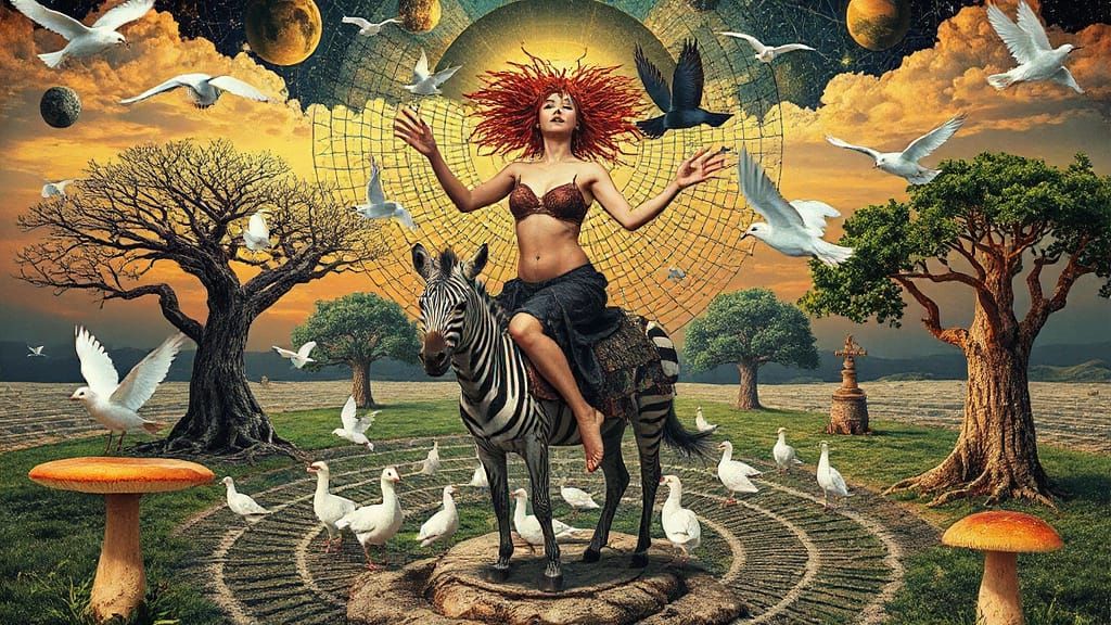 A deified woman, Goddess of the Living World, rides a zebra through a surreal, textured landscape filled with plants, birds, and cosmic elements. Rendered with intricate detail and ethereal shapes.