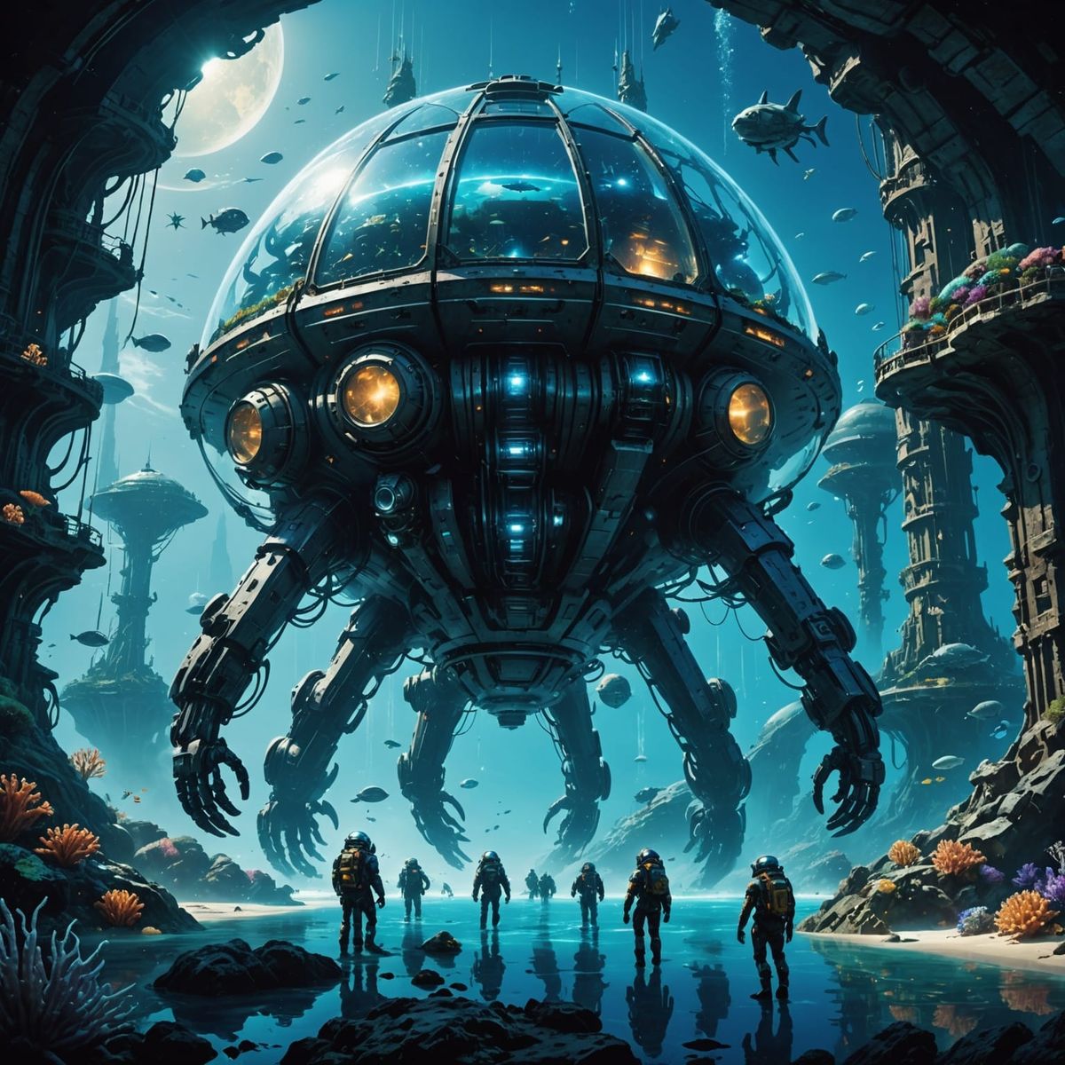 This image shows an underwater city with vast glass and metal structures softly glowing in the deep blue. Human explorers in advanced exo-suits walk among alien sea creatures and coral-covered ruins, protected by a bioluminescent energy dome, creating a cinematic and epic scene.