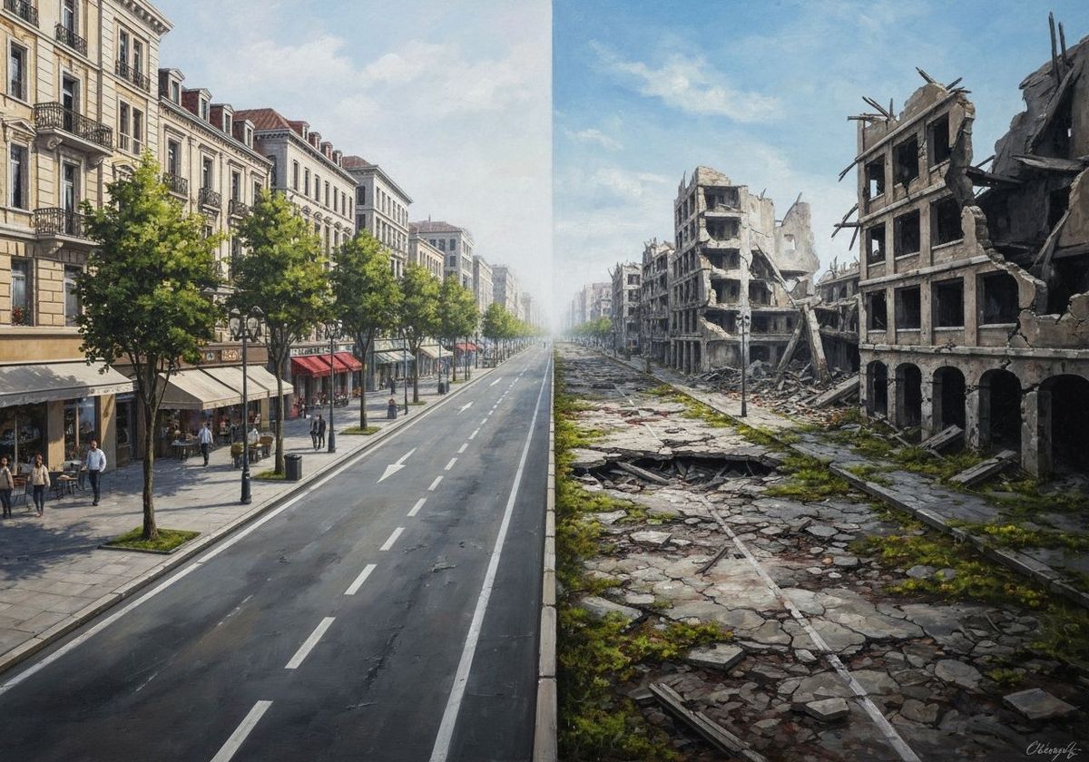 This image shows a cityscape oil painting divided into contrasting sides. One side depicts a vibrant, modern city, while the other shows a ruined, post-apocalyptic landscape. The split image conveys themes of life and death.