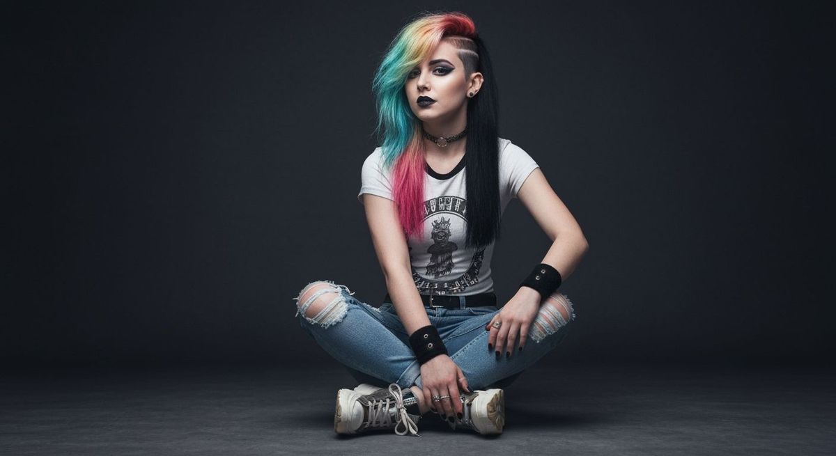 This image shows a punk girl with an asymmetrical hairstyle and confident expression. She is wearing punk fashion and accessories, captured in professional photography style with natural lighting and sharp focus.