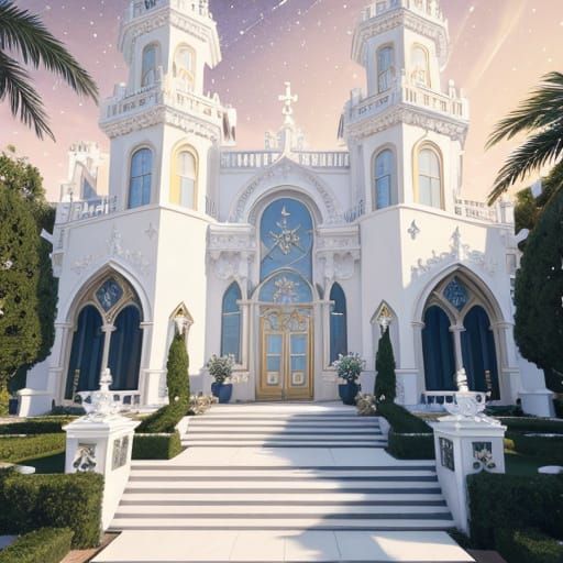A striking picture of a baroque villa at Alys beach, featuring ornate golden spires and starry snowflake motifs. Soft sunset lighting and ice crystal details enhance this opulent oil painting.