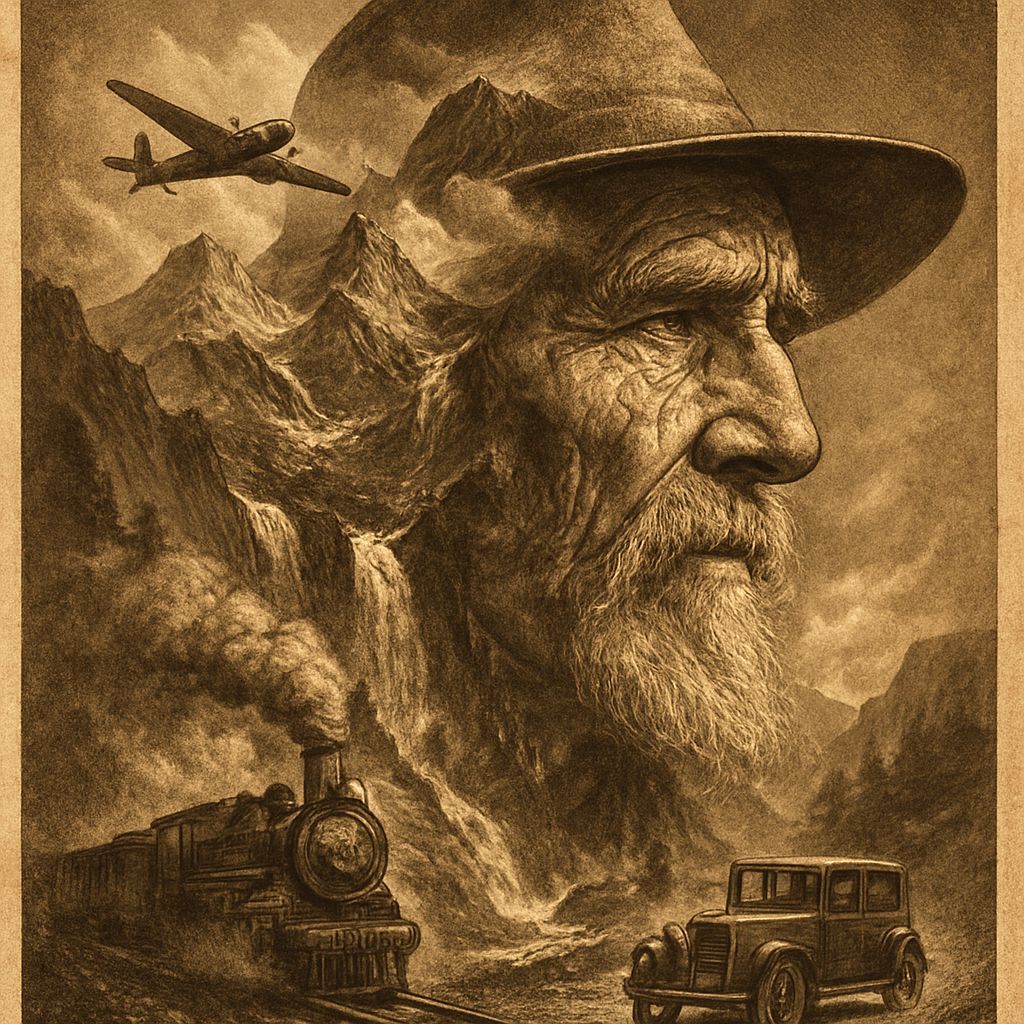 This image shows a vintage postcard with a double exposure silhouette of a weary traveler's face. The weathered skin shows mountains, waterfalls, planes, and trains in sepia tones with dynamic lighting.