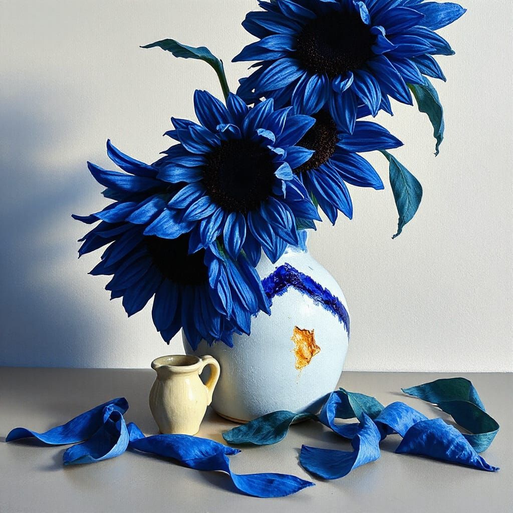 A striking picture of indigo sunflowers with drooping cobalt-blue petals in a stout white vase. This highly textural still life uses thick impasto and sgraffito techniques, with side lighting creating crisp shadows in an expressionist style.