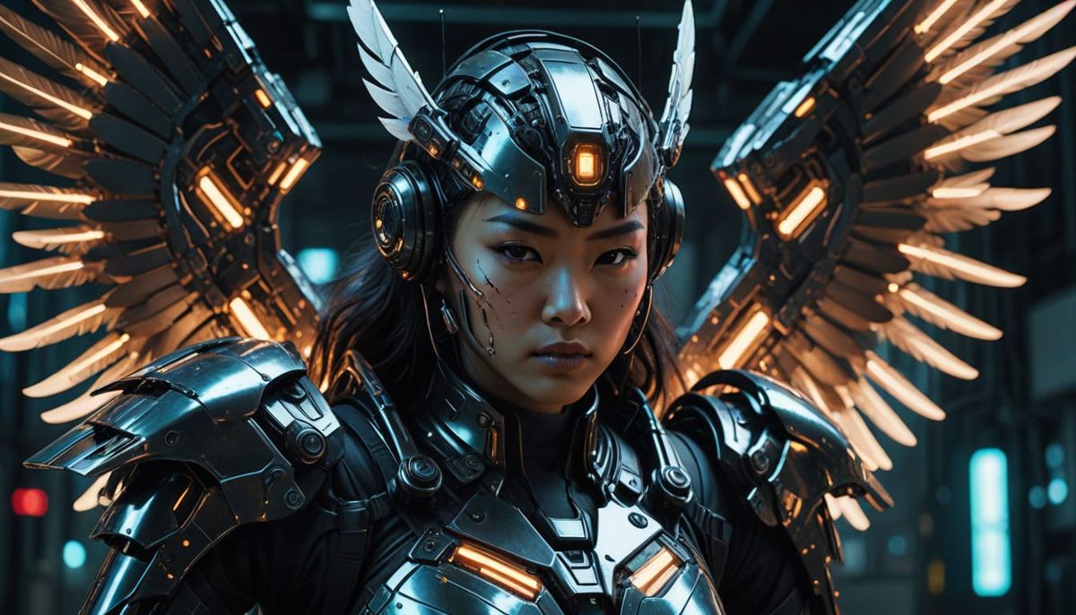 A striking picture of an Asian woman with mechanical wings in a cyberpunk aesthetic. She holds a glowing spear, illuminated by neon lights and dynamic high contrast lighting.