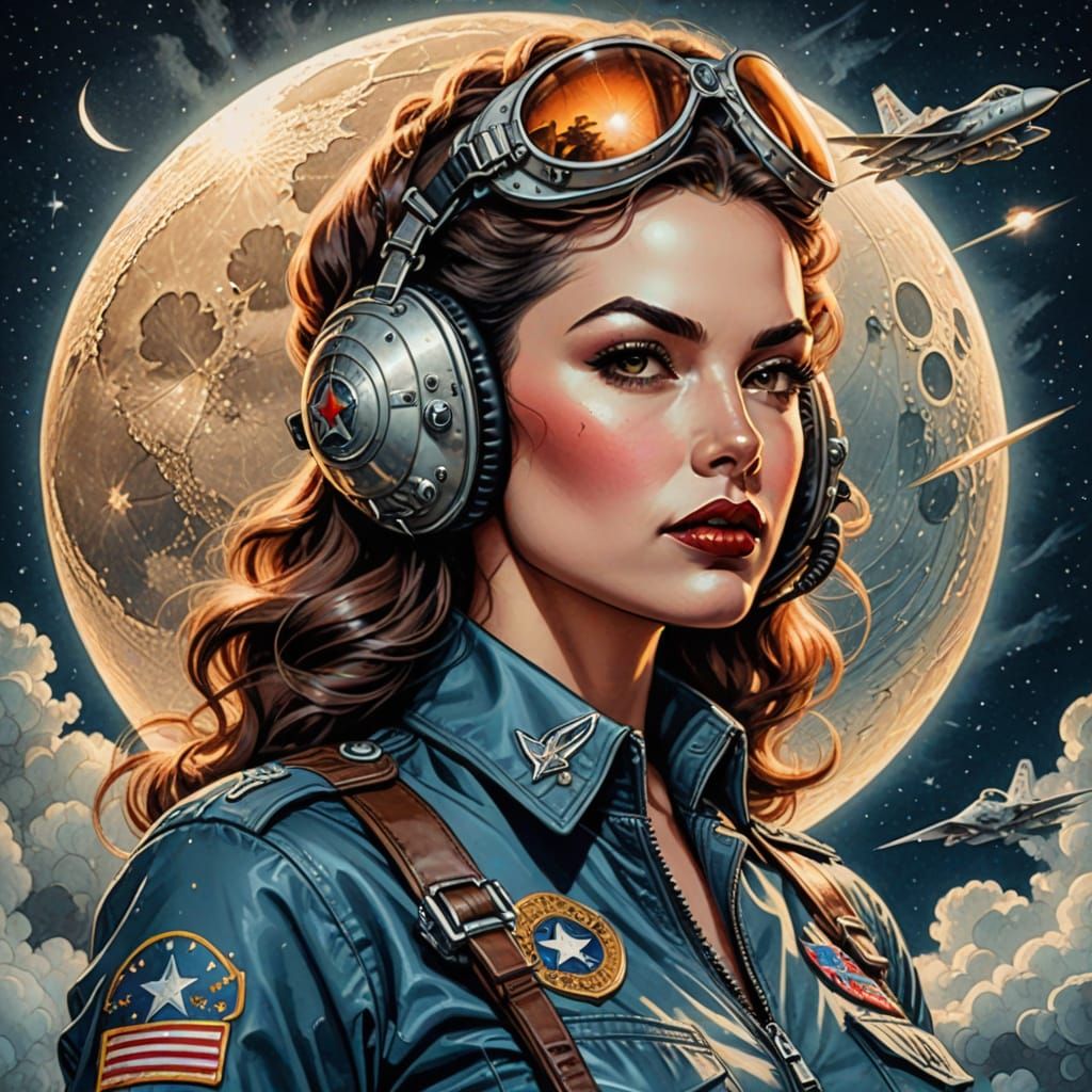 This image shows a pin-up style portrait of an airforce pilot at dawn. The artwork features stipple art, ink wash, and watercolor calligraphy, rendered with fine details in a retrofuturistic aesthetic.