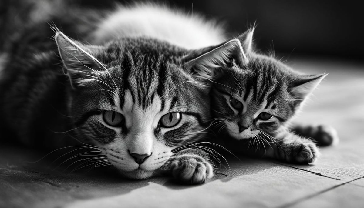 This image shows a heartwarming black-and-white portrait of a cat mom tenderly embracing her newborn kittens, their tiny paws reaching out in a sweet gesture, captured in a soft focus style with gentle shadows and a warm glow, reminiscent of classic film photography.