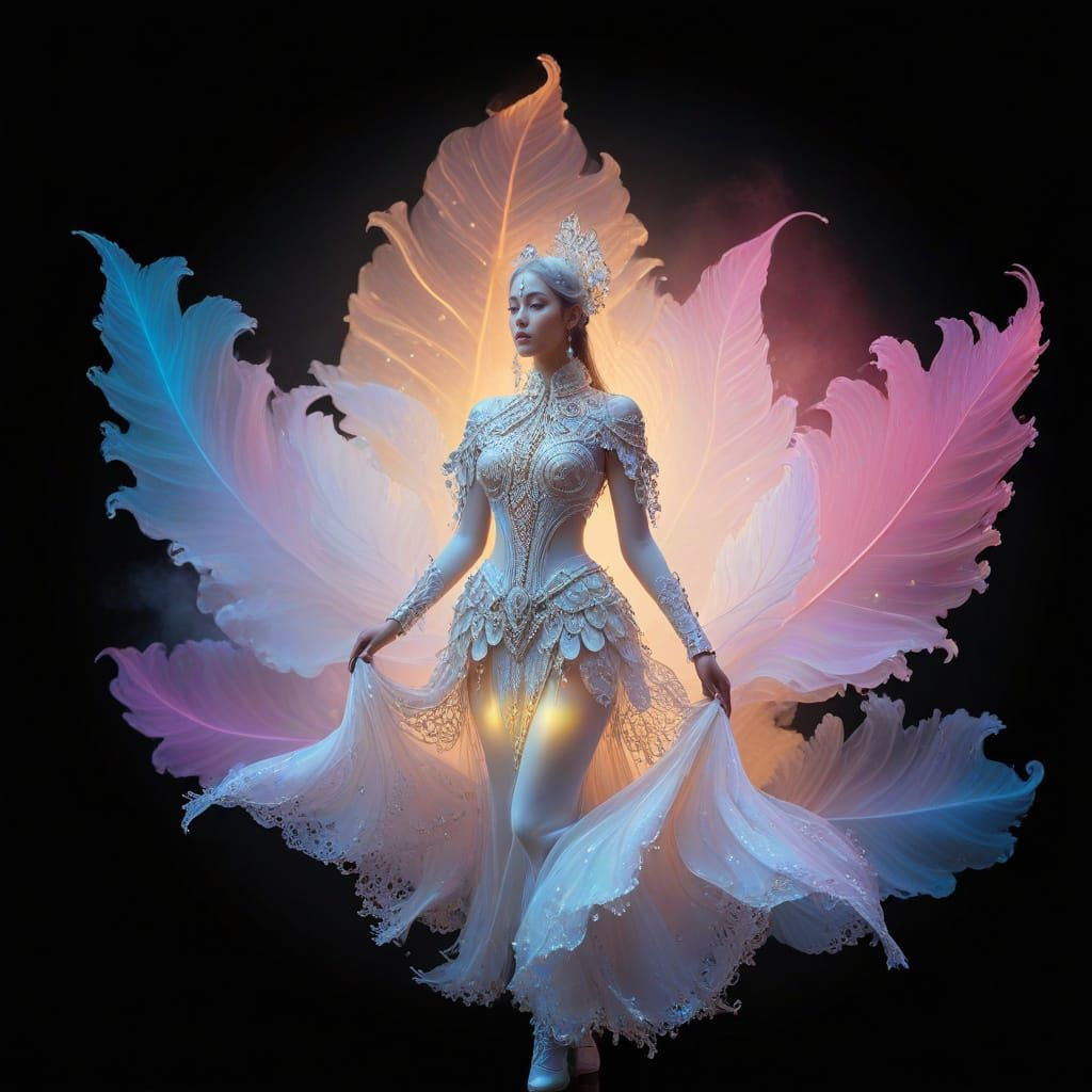 "A minimalistic and ethereal environment infused with astral and symbolic vibes, featuring glowing mist and dreamlike hues. The backdrop should include fluid, petal-like forms and organic symmetry, evoking a sense of connection to nature and the cosmos, reminiscent of a mystical temple. An abstract representation of a perfect Russian-Indian female figure, depicted in soft, undulating forms that suggest ornate armor, embodying a fusion of cultural elegance and strength. Incorporate ..."