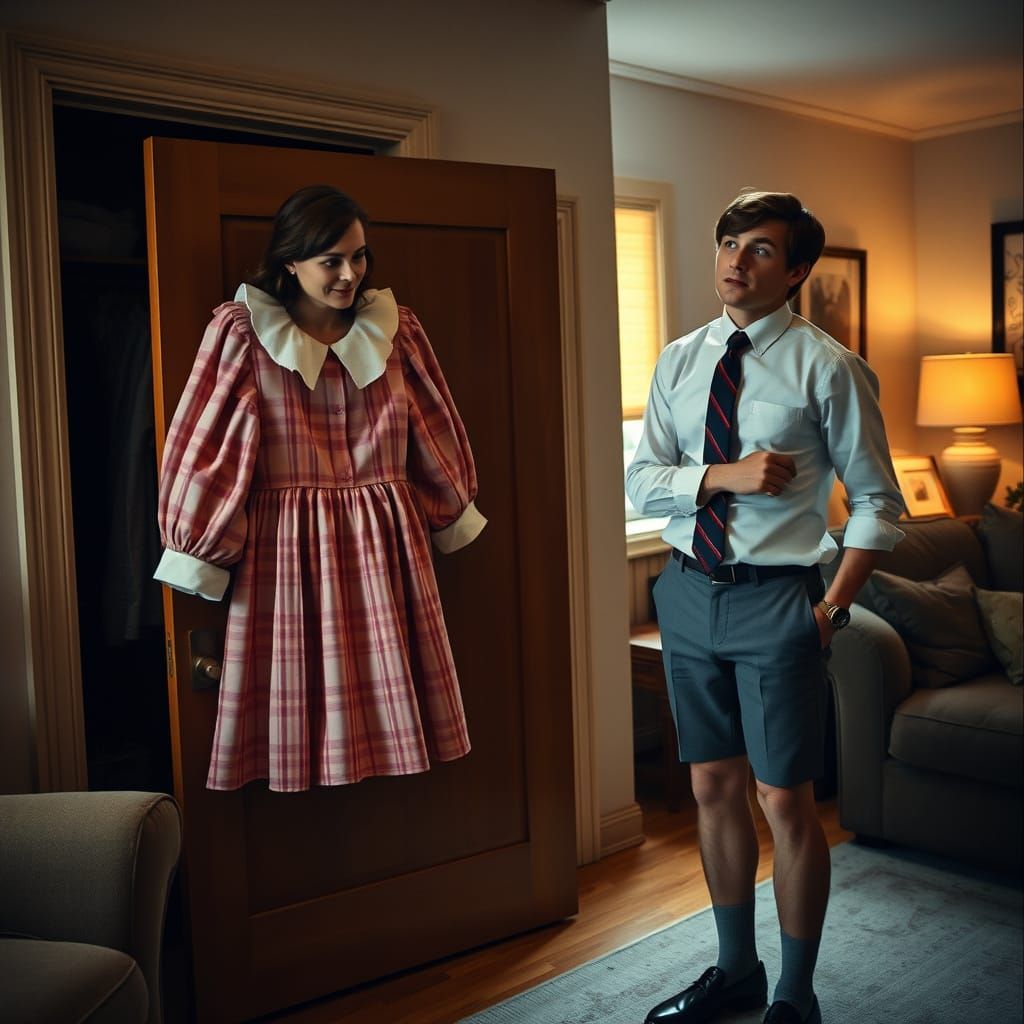 This captivating film still captures a woman's charming smile as she invites a concerned young man into a cozy living room, where a stunning light pink tartan dress hangs elegantly on a closet door, evoking the nostalgic feel of 35mm film with its dramatic lighting and cinematic flair.