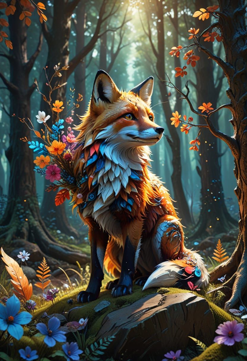 This enchanting image depicts a fox with a long, glowing tail standing amidst a vibrant forest of flowers, rocks, and trees. Inspired by pop art and oil painting techniques, the fox's fur shimmers with intricate details and bold, triadic colors, set against a backdrop of soft, golden lighting and dappled...