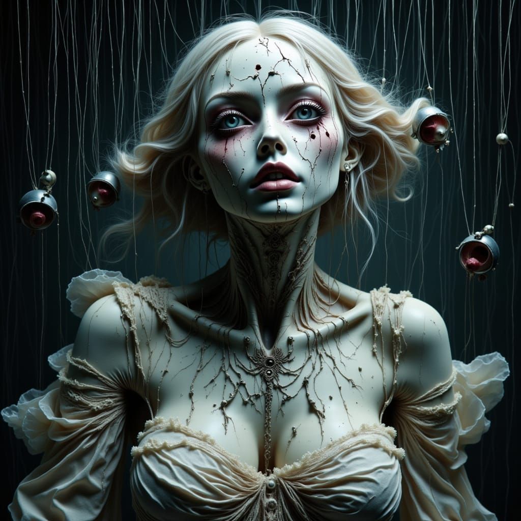 A dark fantasy concept art portrait of a woman as a cracked porcelain marionette, forced to dance on a bizarre stage. Features dynamic lighting and intricate detail in a painterly style.