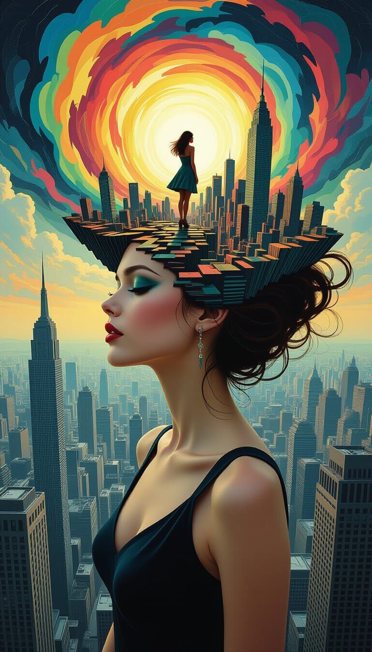 This image shows a woman standing on a skyscraper rooftop. Her head contains surreal towns, set against a dark, detailed cityscape in a Beksiński-esque style. It features art deco and futuristic elements.