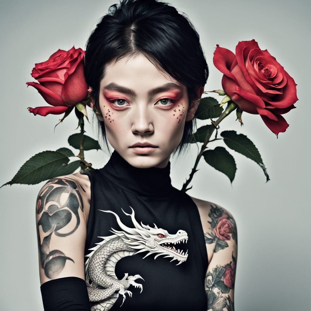 This is a high fashion editorial photo of a woman with a cool rose and dragon tattoo.