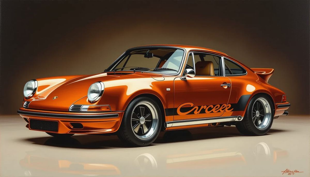 This hyperrealistic painting depicts a 1973 Porsche 911 Carrera RS 2.7 race car in copper metallic. Rendered with dramatic lighting and intricate detail, it showcases the car's sleek lines and elegant design.