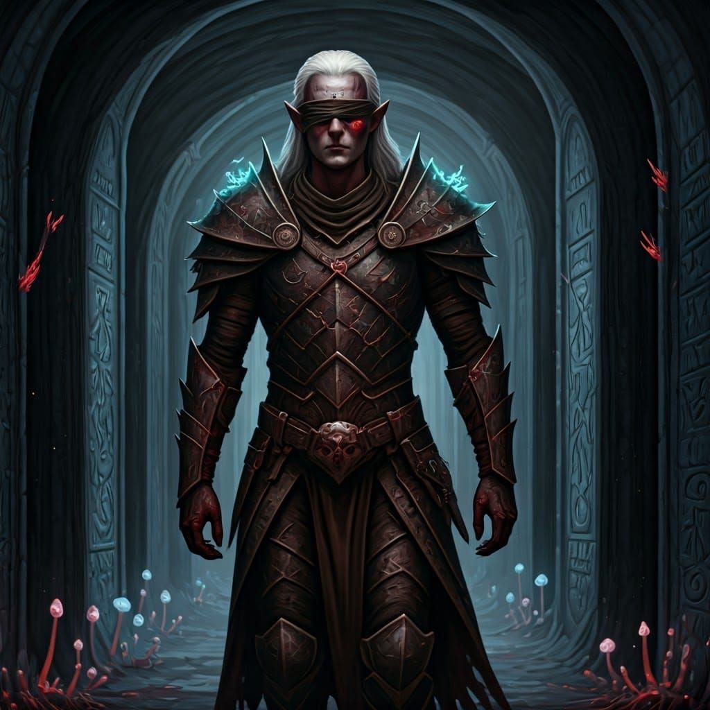 This image depicts a blind drow slave leading others through a tunnel. The scene features cracked armor, glowing mushrooms, and ancient carvings, creating a dark fantasy atmosphere.