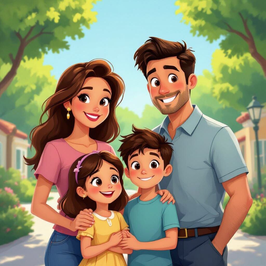 This image shows a smiling family of four: mother, father, older brother, and sister. The vibrant scene is reminiscent of classic Disney animation, with bold lines and exaggerated features in a fantastical cartoon style.