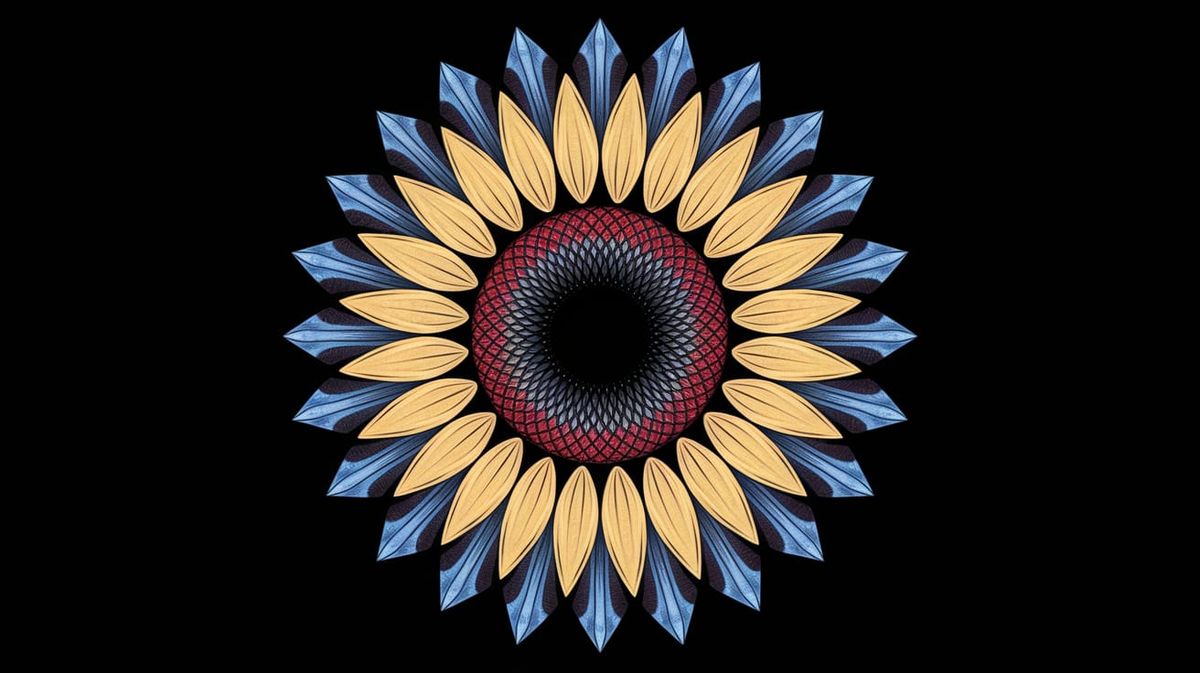 A vivid image of a sunflower rendered as a complex fractal. The artwork features a metallic color scheme in a pop art style, enhanced with geometric designs and digital illustration techniques.
