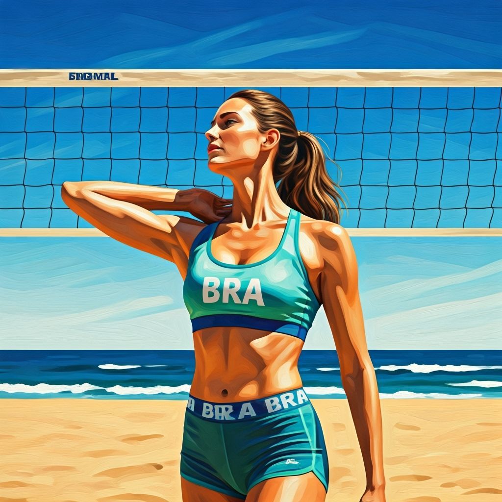 This vibrant image captures a woman engaged in beach volleyball, wearing a blue and green sports bra and shorts. The scene evokes a sunny coastal atmosphere with dynamic brushstrokes and bright colors.
