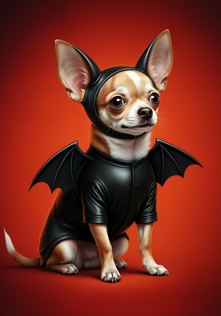This image shows a playful chihuahua in a custom bat costume, featuring pointed bat ears and a sleek design. Rendered in a vibrant comic book style with bold colors and dynamic lighting.