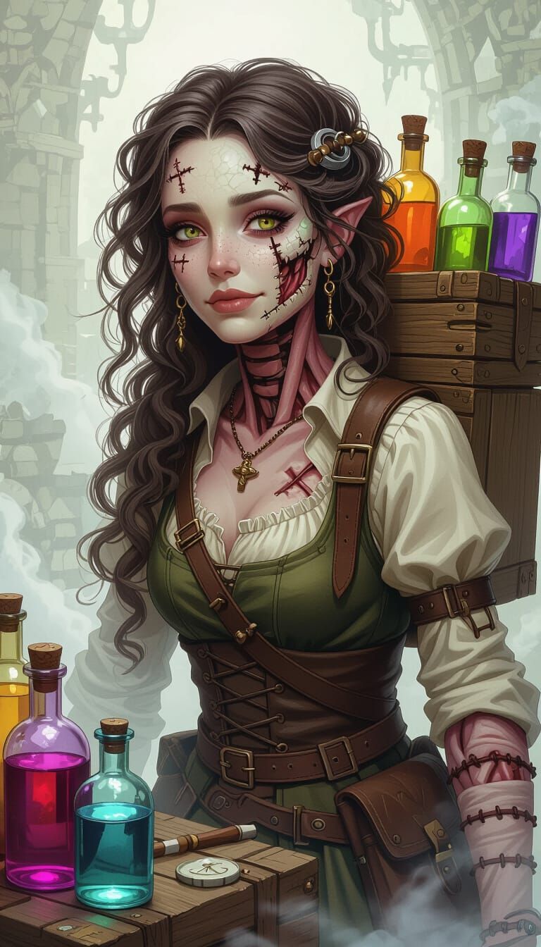 This image shows a detailed fantasy illustration of a flesh golem alchemist. Her face is stitched together, with contrasting skin tones. She wears alchemist attire amidst glowing bottles, with mist and soft light creating a wondrous atmosphere.