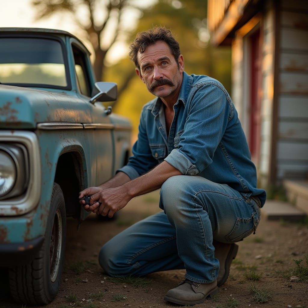 This image shows a weathered man repairing a pickup truck in the evening light. The photorealistic portrait captures the subject's rugged features and rustic surroundings.