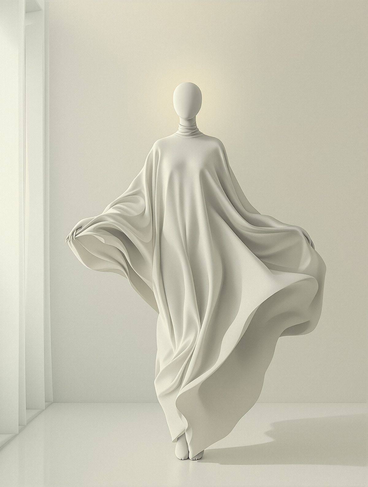 This image shows a serene, abstract figure representing ambient corporate muzak in a light-filled, minimalist office. Rendered in a dreamlike digital painting style with a muted color palette.