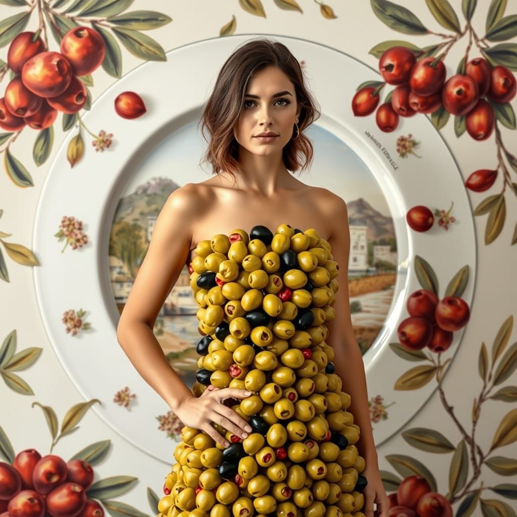 This image shows a woman wearing a dress made from a mosaic of small, realistic olives against a vibrant Mediterranean-inspired backdrop, reminiscent of traditional ceramics.