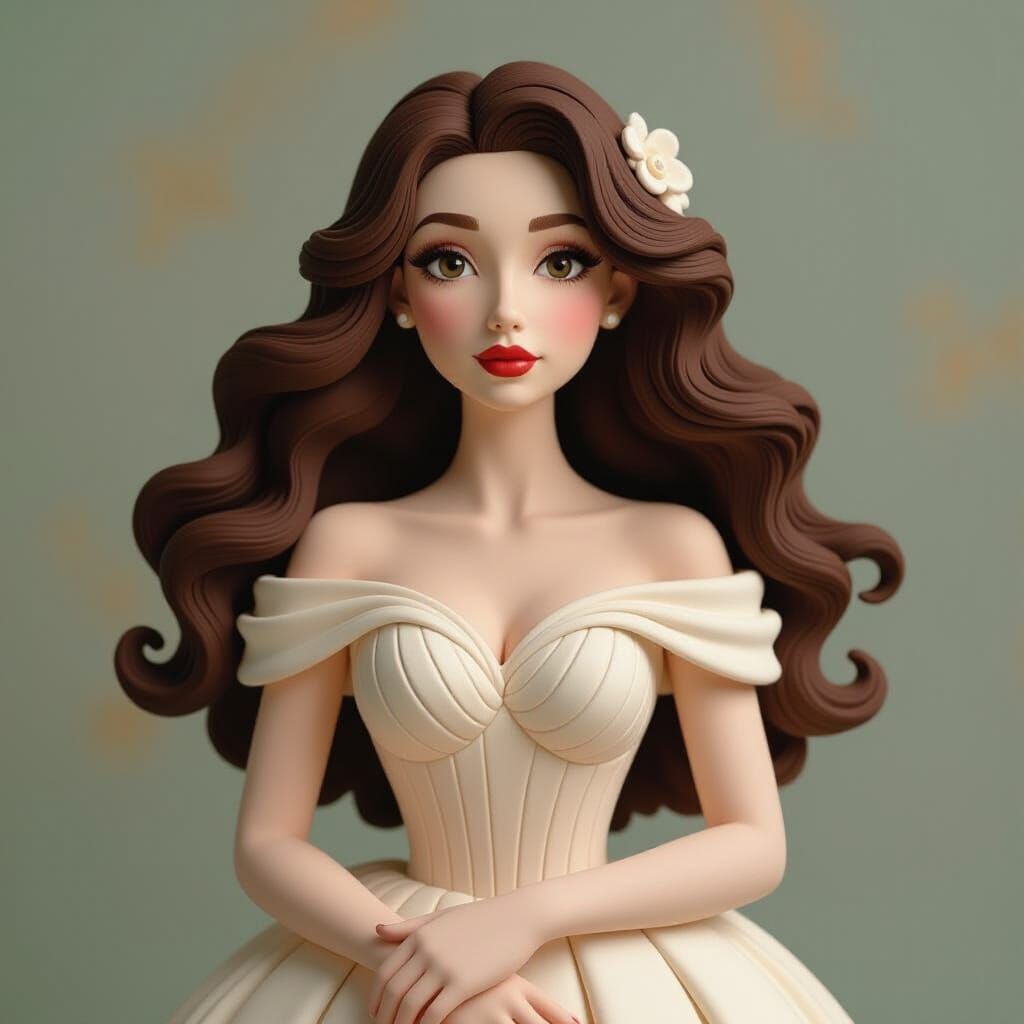 This image shows a beautiful young woman with flowing hair and refined features, wearing an elegant gown. The character is rendered as soft, pliable clay with surreal, pop art, digital painting elements.