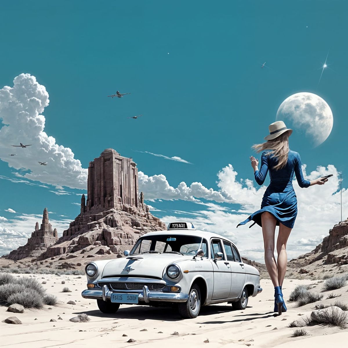 This image shows a mysterious woman in a spy movie setting, catching a taxi under a starry desert night sky, with a distinctive Moebius-inspired aesthetic in muted grey and blue tones.