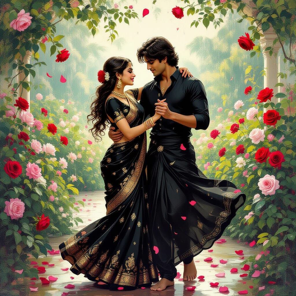 A captivating image of a girl in a black saree dancing with a boy in a rose garden during a rain shower. The artwork evokes a romantic, ethereal aesthetic.
