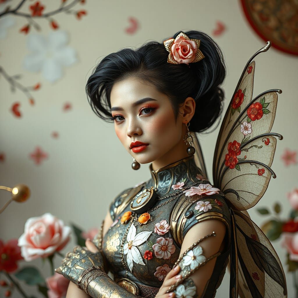 A striking picture of a cyborg geisha fairy with floral etched metal skin and delicate wings of woven wires. This hyperrealistic digital artwork blends traditional and futuristic elements.