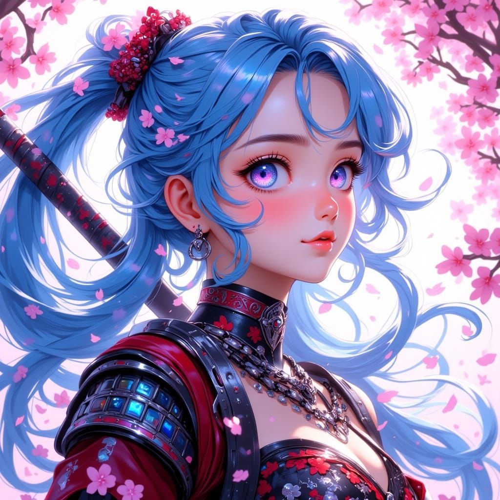 This image shows an anime samurai girl with long blue hair and a gentle smile, holding a katana. She wears traditional armor amidst falling cherry blossoms, rendered in a vibrant, soft-lit anime style.