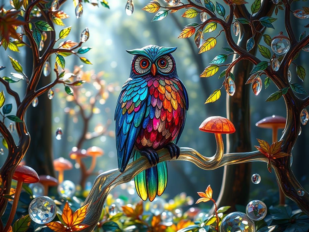 In the heart of a fantastical forest made entirely of colored glass, a majestic owl perches silently on a crystalline branch. Its feathers shimmer in the sunlight like fragments of a rainbow, each one crafted from vibrant stained glass in shades of sapphire, amethyst, emerald, and gold. As the light filters through the trees—towering sculptures of molten glass shaped into fantastical trunks and delicate leaves—the forest sparkles with shifting colors and dappled reflections.