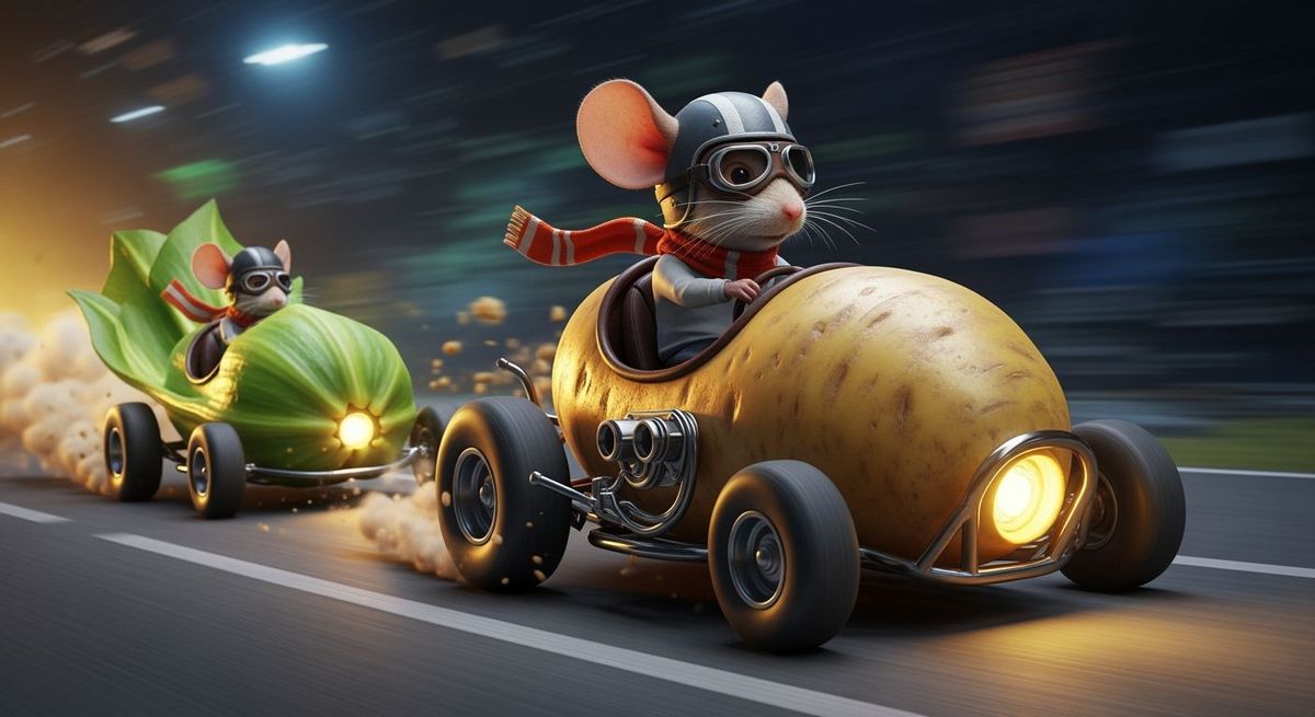 A striking picture of two mice racing in vegetable-shaped vehicles. The image showcases a hyper-realistic, cinematic style with high contrast, sharp focus, and HDR lighting, reminiscent of digital artwork.