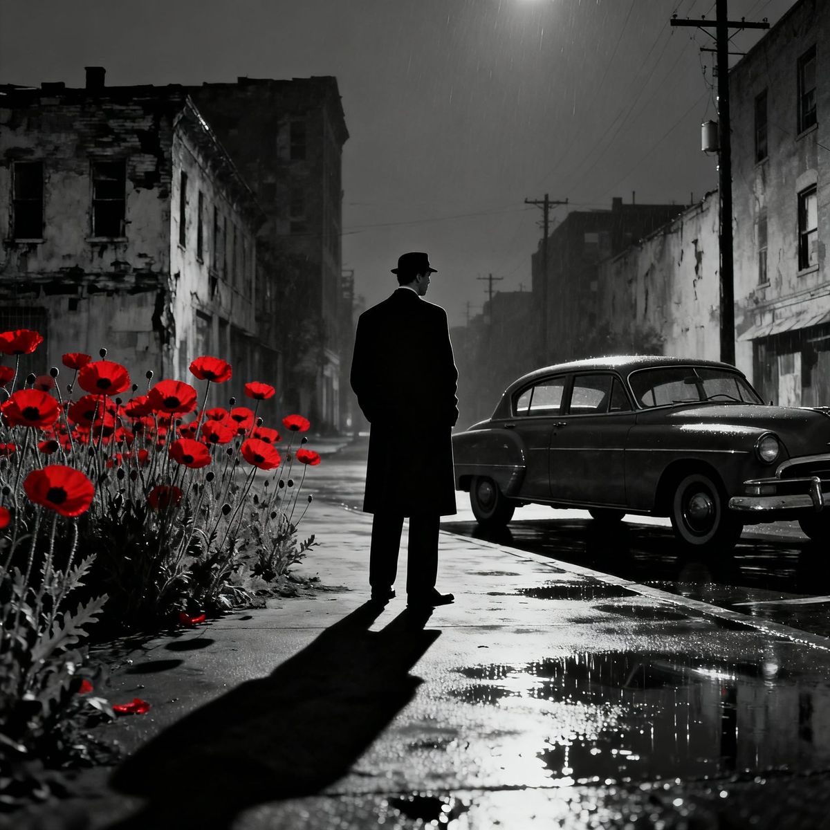 This image depicts a lone detective on a wet city street beside a vintage car. Dramatic lighting and blooming poppies create a mysterious, atmospheric noir scene.