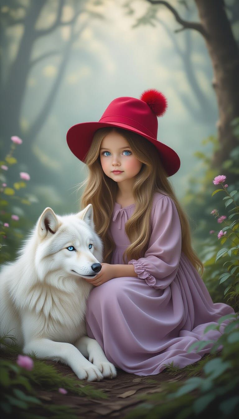 This image shows a beautiful little girl with long, flowing mauve hair and blue eyes, wearing a red hat and lilac dress, playing with a white wolf in a serene, misty forest. Studio quality, hyperrealistic photograph with divine lighting.