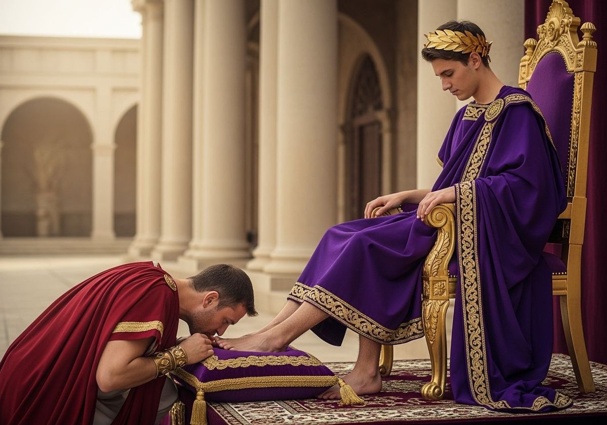 This image shows a young Roman Emperor in an embroidered toga sitting barefoot on a gold throne. A senator kneels to kiss his feet in this photograph with natural lighting and bokeh.