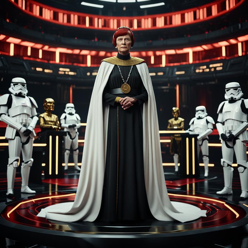 This image shows Mon Mothma in a Star Wars scene. She is depicted as an Imperial Grand Moff in red, black, and gold, addressing senators from a futuristic podium in detailed, gritty 3D.