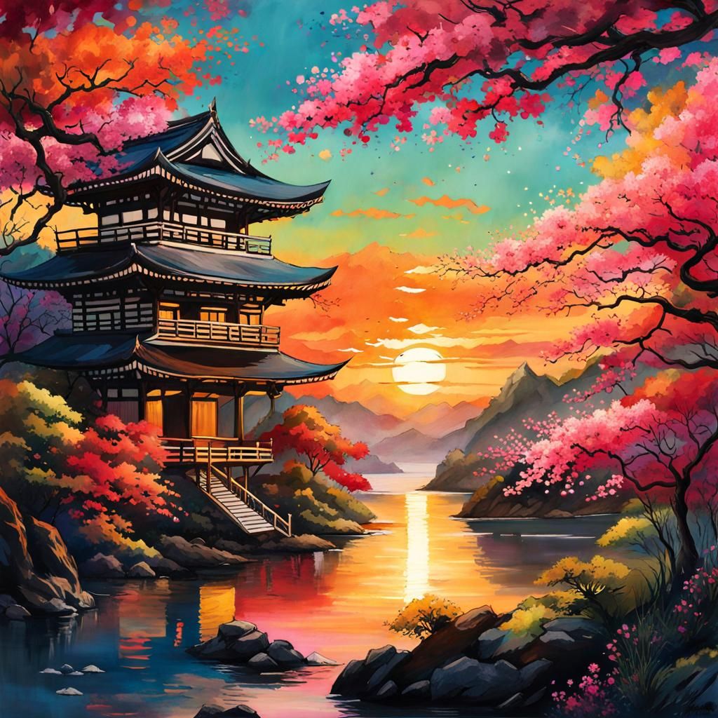 A digital illustration showing a Japanese summerscape sunset. This vibrant watercolour art style uses splashy techniques, soft cinematic lighting and a pastel colour palette to create an impressionist feel.