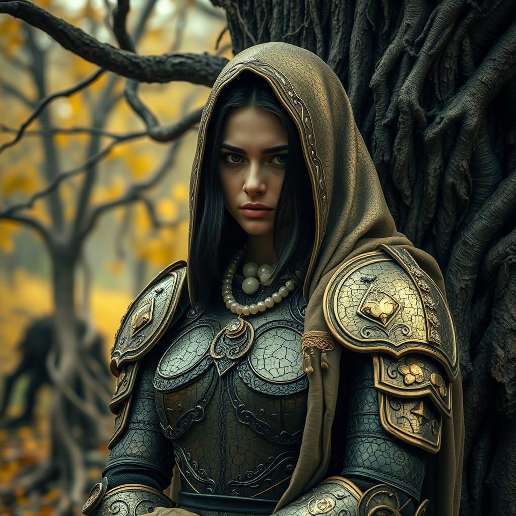 This image captures a sorrowful woman in intricately crafted armor, leaning against a gnarled life tree, surrounded by a soft yellow forest and an eerie aura. Her tragic expression is sharply focused, exuding a sense of melancholy, with delicate metallic textures and high contrast colors reminiscent of f...