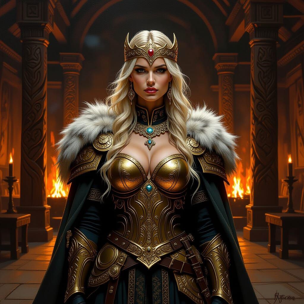 A striking picture of a Viking queen in golden armor and a fur cloak standing in a Norse hall. The artwork features dramatic lighting and dark shadows in an impasto style.