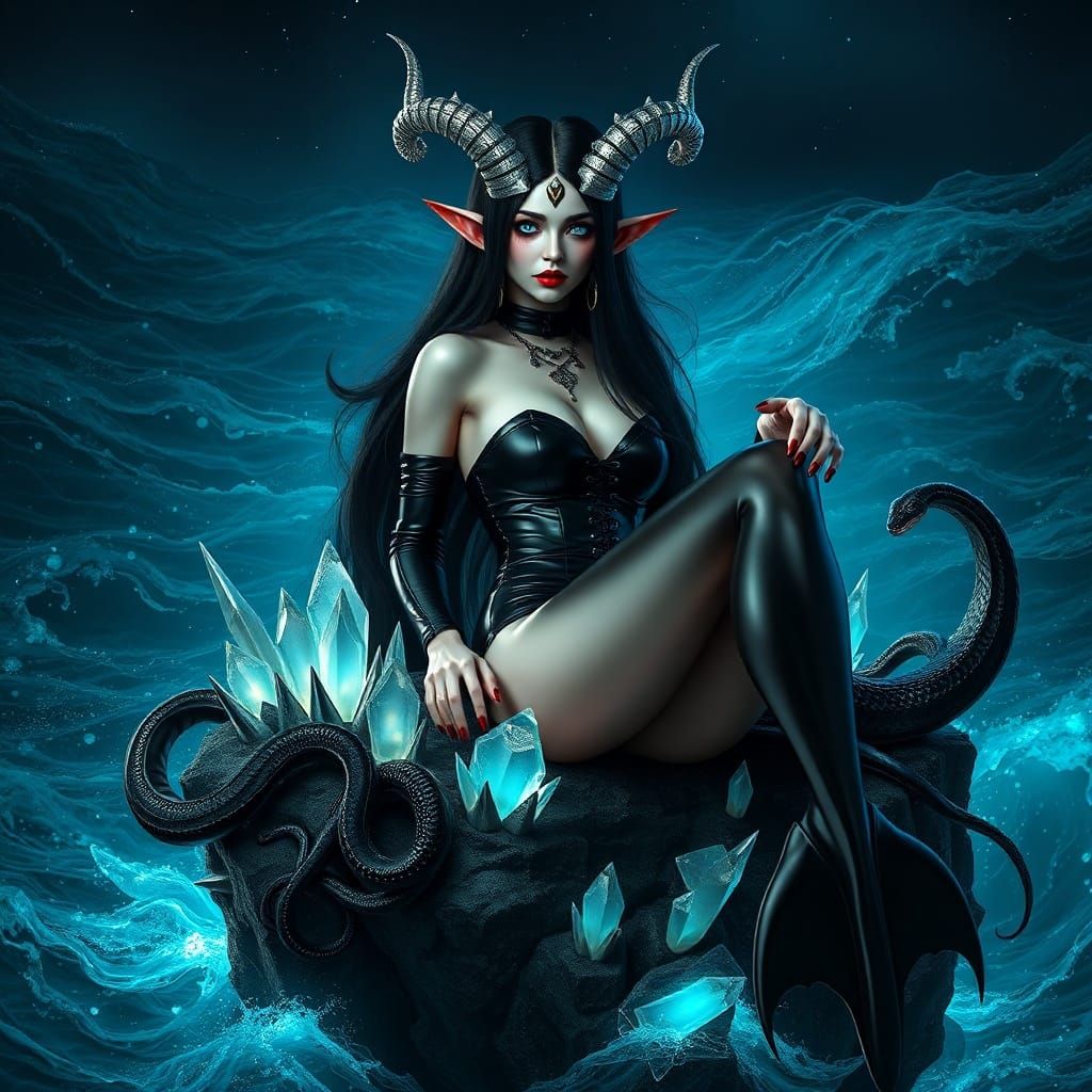 A gothic goddess with glowing blue eyes and silver horns lounges on a dark crystal rock amidst a turbulent, bioluminescent ocean, rendered in a dramatic, hyperdetailed concept art style.