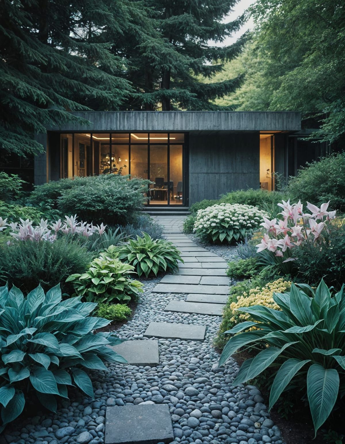 This image showcases a Brutalist garden with Impressionistic touches, featuring weathered paths, geometric stones, and vibrant irises. Blends heavy architecture with delicate floral elements for vintage vibes.