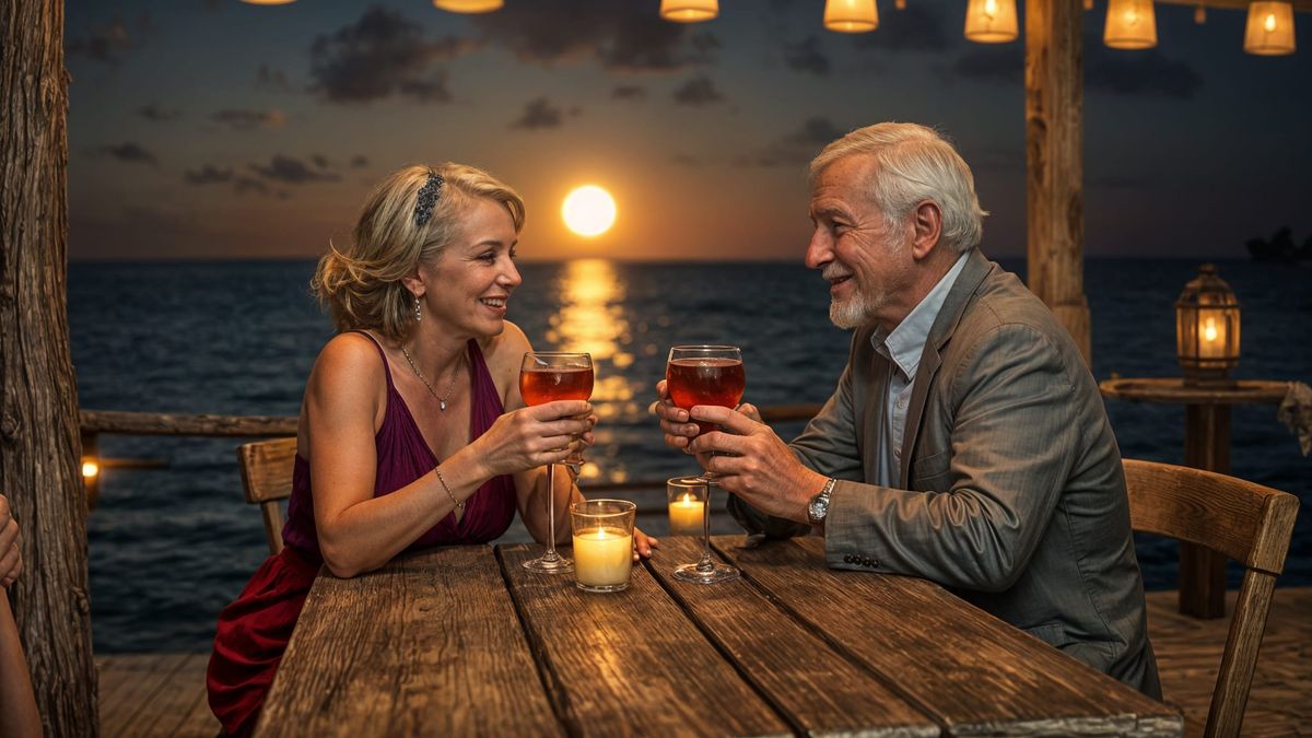 This image shows an elderly couple enjoying cocktails at a seaside table under the night sky. The scene is rendered with ultra-realistic detail and high resolution.