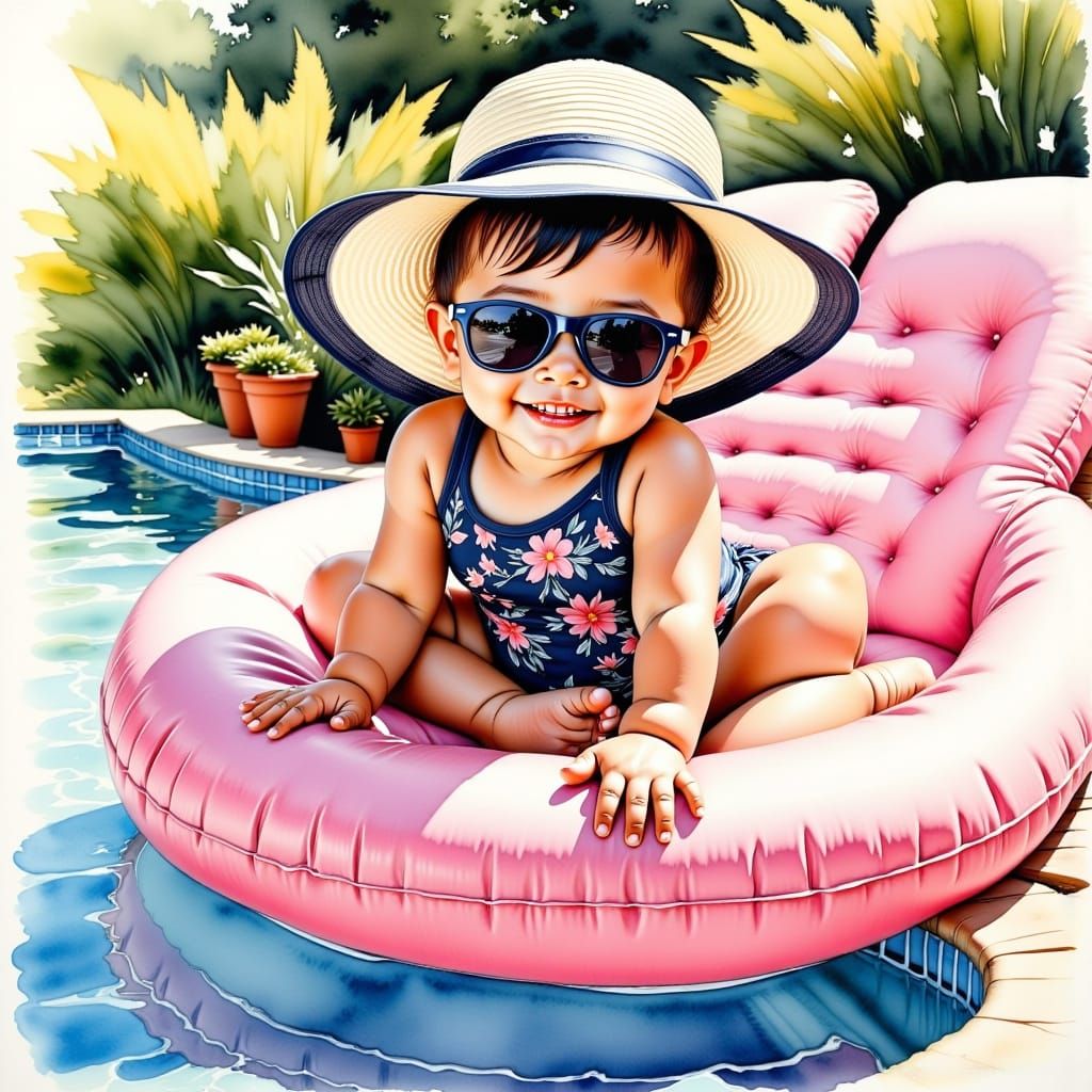 A vibrant watercolor and acrylic painting of a child in a sun hat and sunglasses relaxing on a pink inflatable lounger by a pool in bright sunlight. The artwork features high detail and reflections.