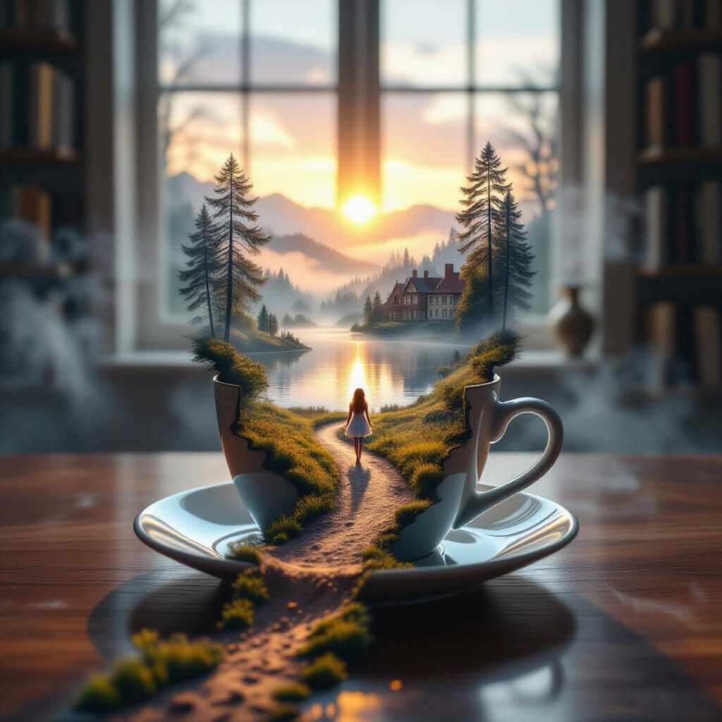 A tilted cup spills a 5D holographic landscape onto a dining table: a misty lake at crimson dawn with a golden haze, a forest, houses, and a dusty path leading to a beautiful girl. This three-dimensional fairy tale comes to life, with the dusty path continuing along the table and out of thick fog. Behind ...